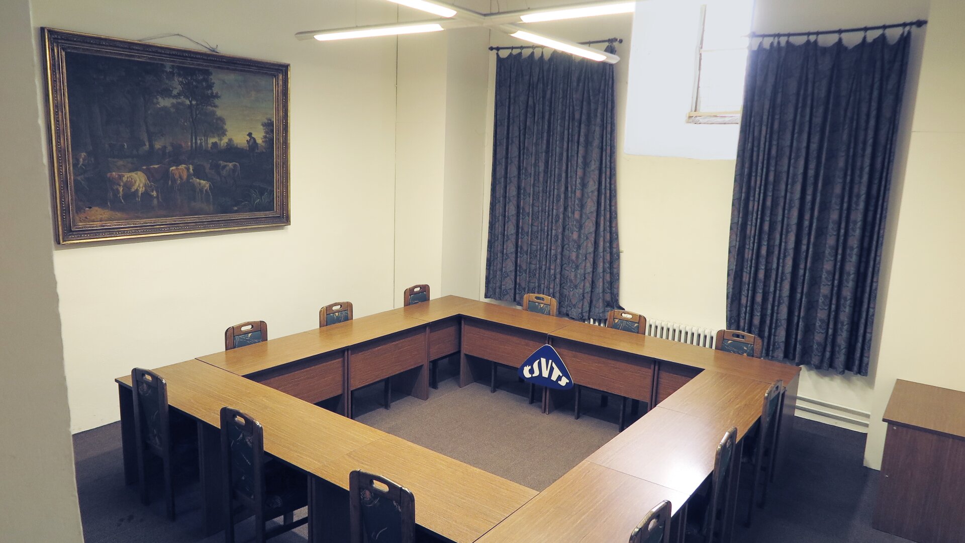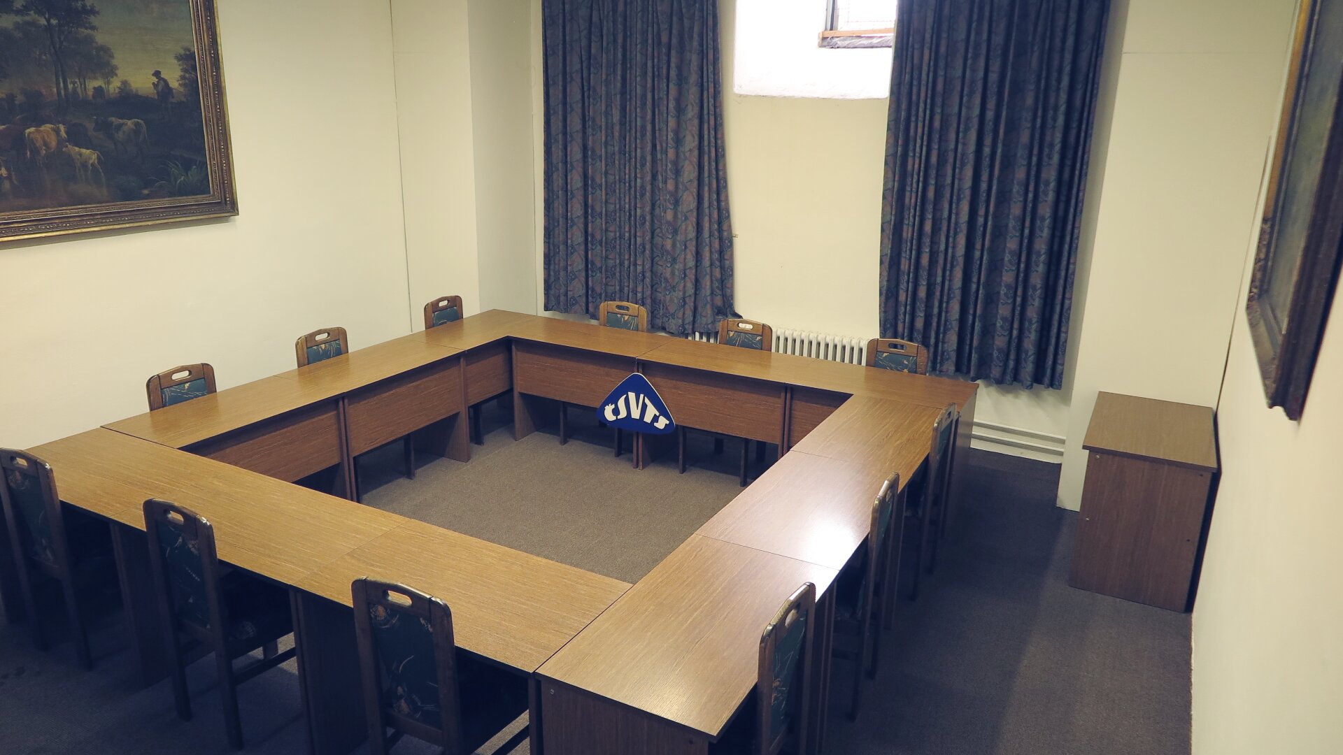 Sál umístěný v historické věži. Vhodný pro jednání. Čtvercové uspořádání stolů.